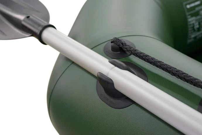 De Kolibri K-220 T karperboot beschikt over een handvat, geïntegreerde roeidollen en een relinglijn aan elke zijde. Doordat de K-220 T beschikt over twee individuele drijvers houdt u ook bij een onverhoopt pechgeval altijd één drijvend gedeelte over. Deze rubberboot wordt standaard compleet geleverd met een transporttas, peddels, een houten zitbank en een handpomp. De Kolibri K-220 T beschikt over een optionele geïntegreerde nylon stootrand en kan verder worden voorzien van een motorsteun. De karperboot kan dan worden uitgerust met een elektrische buitenboordmotor.