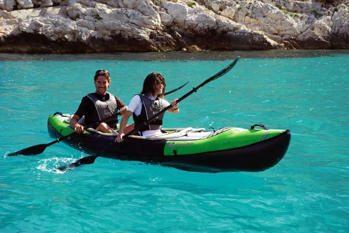 De Sevylor Yukon is een 2-persoons opblaasbare kajak van de beste kwaliteit. Deze kajak is uiterst geschikt voor de professionele outdoor-liefhebber en is een zeer betrouwbare partner op het water. Door de spitse vorm en de lange neus is de kajak stabiel en wendbaar. De Sevylor Yukon is geschikt voor kalme wateren, stromende wateren en zeer snel stromende (witte) wateren. De verwijderbare vin en de manouvreerstrips zorgen ervoor dat de Sevylor Yukon ondanks stroming zijn koers behoudt.